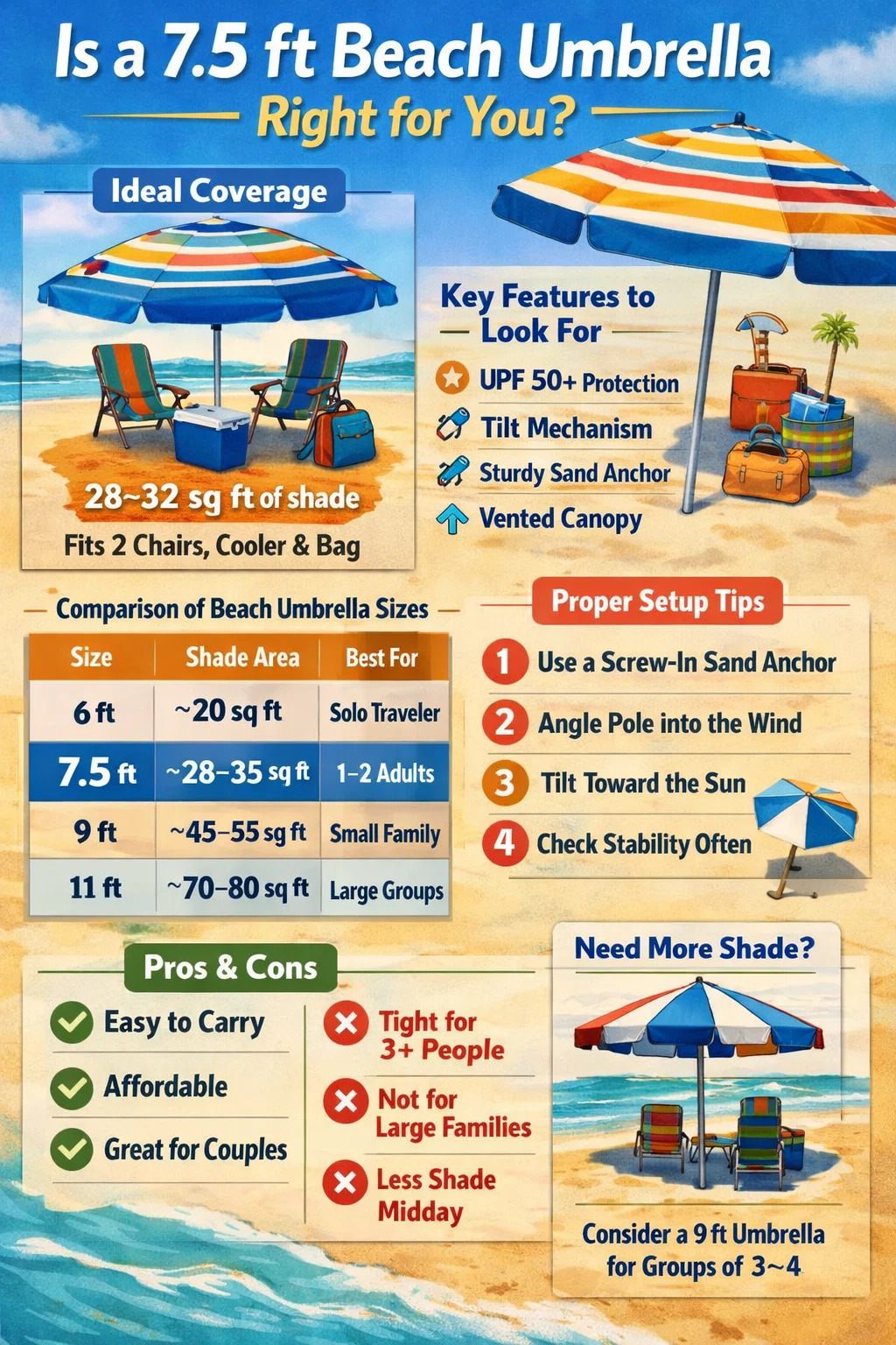 Se hai bambini piccoli, tieni presente che i bambini tendono a distendersi. Un ombrellone da 7,5 piedi va bene per un adulto più uno o due bambini piccoli, ma due adulti con bambini attivi potrebbero sentirsi angusti. In tal caso, due ombrelloni separati da 7,5 piedi affiancati sono una soluzione comune che molti bagnanti esperti preferiscono rispetto a un unico baldacchino di grandi dimensioni che è più difficile da ancorare.