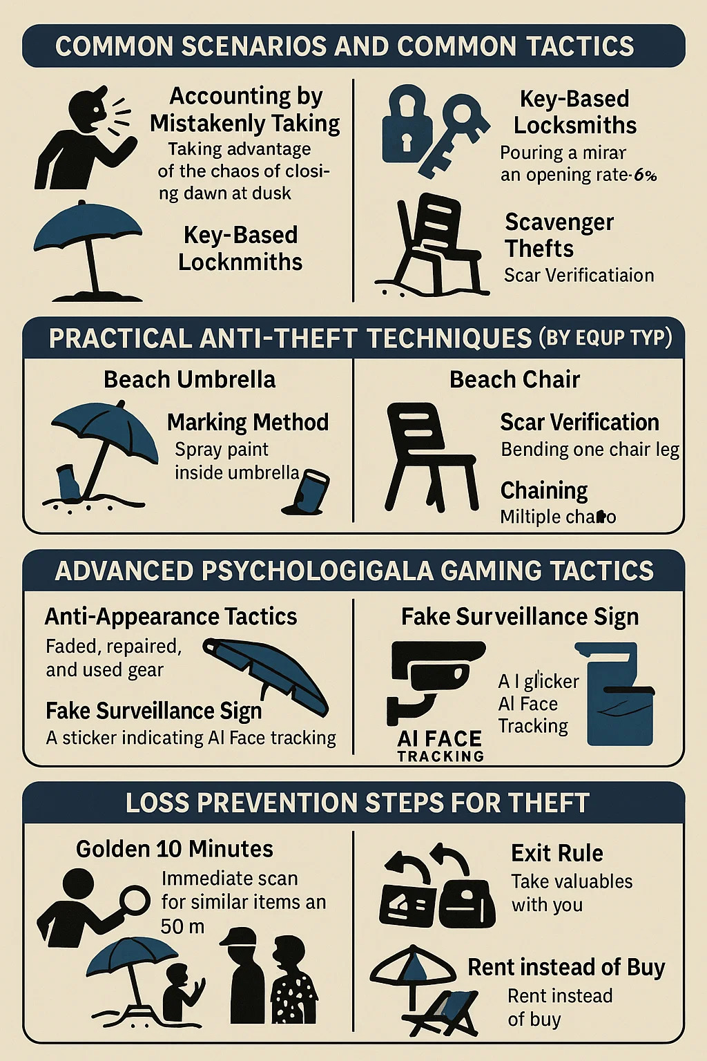 Sì, il furto di ombrelloni da spiaggia e le sedie sono un problema comune sul lungomare. Di seguito è riportata una strategia di risposta a più livelli basata sull’esperienza dei gestori delle spiagge e dei visitatori abituali: