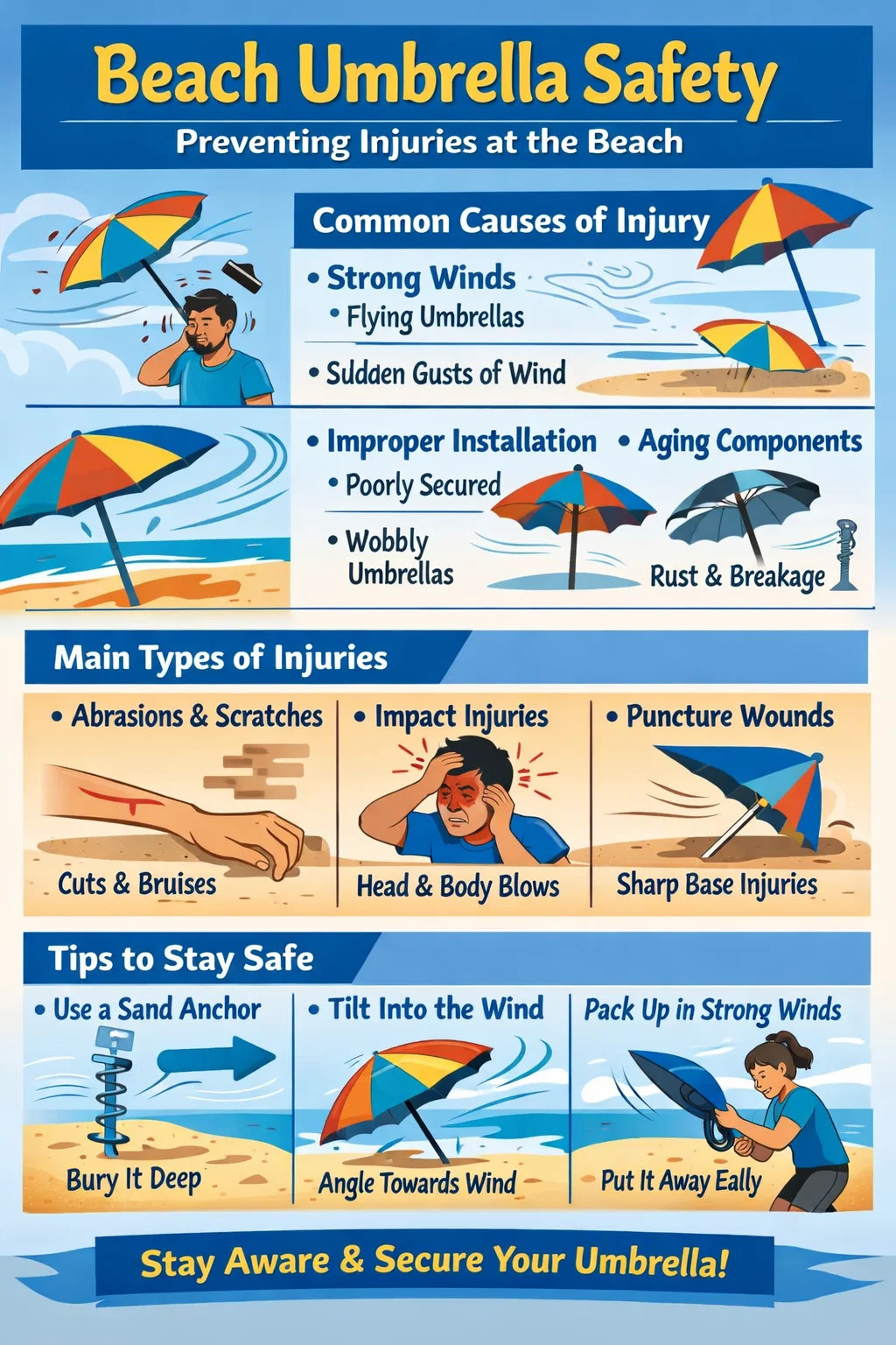 Anche se andare in spiaggia è pensato per rilassarsi, ombrelloni da spiaggia , se non adeguatamente fissati, possono effettivamente diventare un potenziale pericolo per la sicurezza. Ogni anno molte persone rimangono ferite mentre si godono il sole.