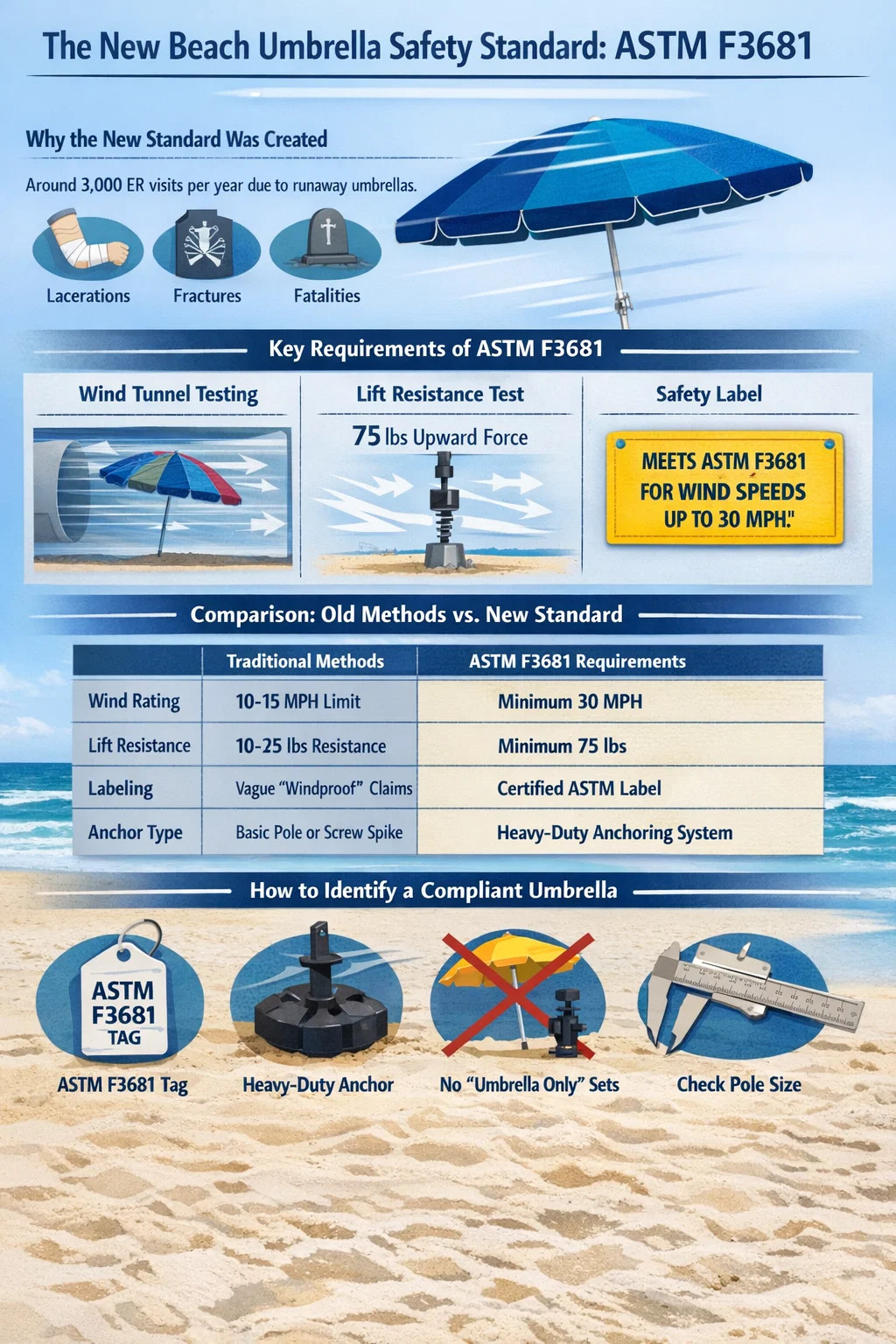 Il il nuovo standard per gli ombrelloni è ASTM F3681-24 (aggiornato a F3681-25) , che stabilisce i primi requisiti prestazionali ufficiali per la resistenza al vento e la sicurezza dell'ancoraggio. Secondo questa nuova linea guida, uno standard ombrellone con un diametro di 7,5 piedi deve essere in grado di resistere velocità del vento fino a 30 miglia all'ora (MPH) senza prendere il volo. Inoltre, il sistema di ancoraggio deve prevedere almeno 75 libbre di resistenza contro le forze di sollevamento verso l'alto per garantire che rimanga saldamente piantato nella sabbia.