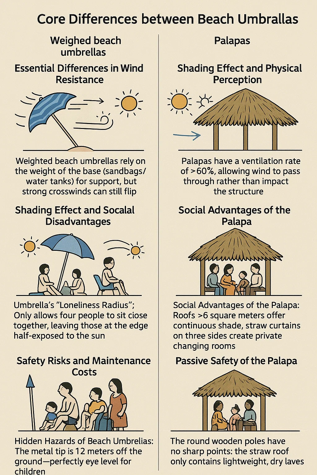 Limitazioni della protezione solare dell'ombrellone: L'ombra sotto l'ombrellone cambia con l'angolazione del sole, richiedendo frequenti regolazioni. Il rivestimento argentato riflette in modo inefficace la radiazione termica del terreno, quindi anche a mezzogiorno, quando la superficie della sabbia è a 60°C, la temperatura sotto l'ombrellone può ancora superare i 40°C. Le Palapas offrono un raffreddamento naturale: le fronde di palma ispessite assorbono il calore anziché rifletterlo, mantenendo un livello di umidità costante (misurato in spiaggia, 3-5°C inferiore rispetto a quello sotto l'ombrellone); l'ombrellone completo non richiede alcuna regolazione.
